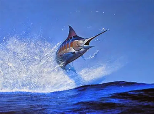 A powerful and aggressive fighter, the blue marlin can run hard and long, sound or dive deep, and leap high into the air in a display of strength.