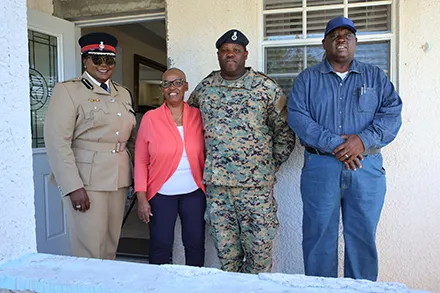 Several residents in Pinder’s Point, Grand Bahama, expressed delight in having the police and other representatives from various government agencies visit and talk with them during a walkabout on Friday, February 2, 2023. Above a resident poses for a photo with Assistant Commissioner of Police and Officer in charge of Grand Bahama and the Northern Bahamas District, Shanta Knowles (left), Senator Kirkland Russell (right) and a representative from the Royal Bahamas Defense Force.