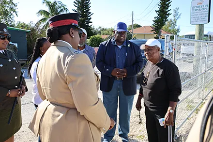 Senator Kirkland Russell, Deputy Director of Urban Renewal in Grand Bahama, along with Assistant Commissioner of Police for Grand Bahama and the Northern Bahamas District, Shanta Knowles, along with other officers, chat with a resident in Pinder’s Point.