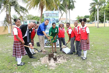 Gerald Cash Primary School: BAMSI’s One-2-One Tree Planting campaign visited Gerald Cash Primary School to plant seagrape and mango trees with members of the school’s sixth grade class and prefect division. Heading the team were BAMSI’s Executive Chairman Senator, the Hon. Tyrel Young, who was accompanied by the Hon. Keith Bell, Member of Parliament for Carmichael. Principal of Gerald Cash Primary Sharon Williams, members of the school’s administrative team and faculty personnel were also on hand for the planting.