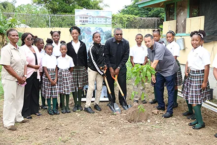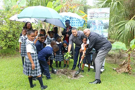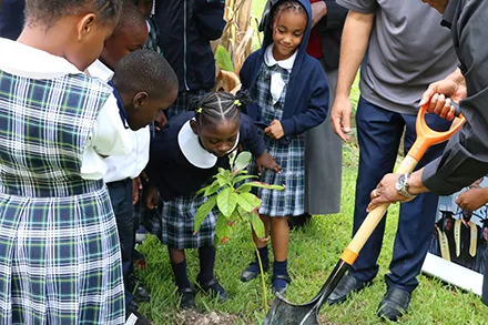 Adelaide Primary School: Overcast skies and light rain were no match for the students of Adelaide Primary School who were excited to be part of BAMSI\'s One-2-One Tree Planting campaign. The young agri-enthusiasts were ready to get their hands on the shovel and to learn more about the cherry and avocado trees that they were planting. Headed by Senator, the Hon. Tyrel Young, Executive Chairman of BAMSI, the One-2-One team was accompanied by the Hon. Vaughn Miller, Member of Parliament for Golden Isles. Rochelle Coakley, Principal of Adelaide Primary, members of her administrative team and teachers were also on hand for the planting.