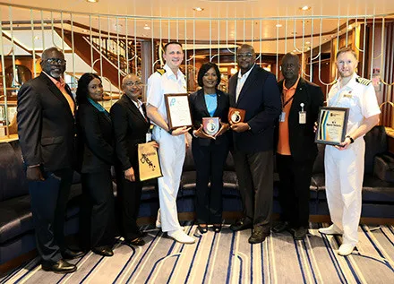 To mark the significance of the occasion, Minister for Grand Bahama, the Hon. Ginger Moxey, Deputy Chief Operating Officer at Freeport Harbor Charles Rolle, and officials of the Ministry of Tourism, Investments and Aviation (MOTIA) participated in a special plaque exchange ceremony during a brief welcome reception aboard the vessel.
