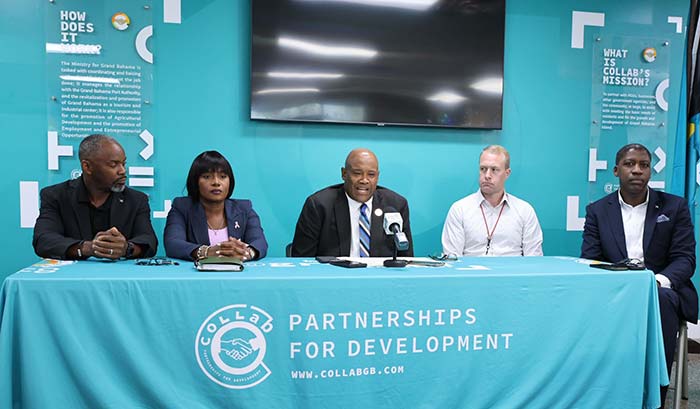 FORMING PARTNERSHIPS – Minister for the Environment and Natural Resources, the Hon. Vaughn Miller (center) speaking to the press about a partnership between his ministry, the Ministry for Grand Bahama, the Grand Bahama Port Authority and Buckeye Bahamas to bring about a sustained solution to the decades-old problems of strong, harmful emissions in Pinder’s Point and surrounding communities, during a press conference on Thursday, October 3, 2024 in the Collab Unit of the Ministry for Grand Bahama. Also on hand for the press conference was Minister for Grand Bahama, the Hon. Ginger Moxey; Minister of State for the Environment and Natural Resources, Zane Lightbourne; Member of Parliament for Central Grand Bahama, Iram Lewis and Vice-President of Buckeye Caribbean Region, Joe Votta. (BIS Photo/Lisa Davis)