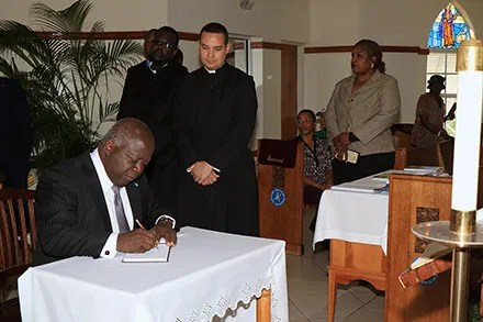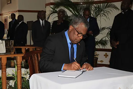 NASSAU, The Bahamas -- Minister of Foreign Affairs, the Hon. Fred Mitchell signs the Book of Condolence at St. Francis Xavier Cathedral, Tuesday, April 22, 2025 on the passing of Pope Francis. (BIS Photo/Letisha Henderson)