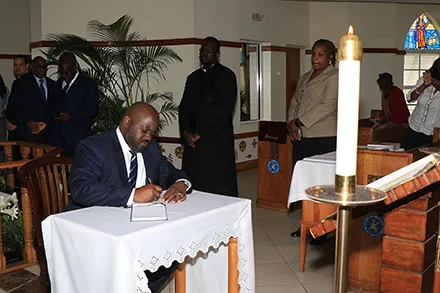 NASSAU, The Bahamas -- Governor General, Her Excellency the Most Hon. Dame Cynthia Pratt signs the Book of Condolence on the passing of His Holiness Pope Francis. The Governor General, the Prime Minister, the Minister of Foreign Affairs and other officials signed the Book of Condolence at St. Francis Xavier Cathedral on Tuesday, April 22, 2025. (BIS Photos/Letisha Henderson)