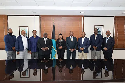 State Minister Lundy, accompanied by Marcellus Taylor, Permanent Secretary for the Ministry of Disaster Risk Management; Alex Storr, Chairman of the DRA; Aarone Sargent, Managing Director/DRA; Captain Stephen Russell, director of NEMA and other officials began their fact-finding mission with a courtesy call on Minister for Grand Bahama, the Hon. Ginger Moxey and newly-appointed Permanent Secretary in the Ministry for Grand Bahama, Joel Lewis.