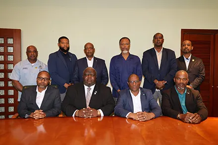 COURTESY CALL – Minister of State in the Office of the Prime Minister, with responsibility for the Disaster Reconstruction Authority (DRA) and the National Emergency Management Agency (NEMA), Leon Lundy (fourth from left) paid a courtesy call on Minister for Grand Bahama, Ginger Moxey (center) on Thursday, February 15, 2024 at the Ministry for Grand Bahama. It was State Minister Lundy’s first official visit to Grand Bahama. Also in the delegation were (from left): Aarone Sargent (Acting Manager and Director), Ralph Hanna (Board Director), Marcellus Taylor (PS in the Ministry of Disaster Risk Management), State Minister Lundy, Minister Moxey, Joel Lewis, (PS for the Ministry of Grand Bahama), Alex Storr (Chairman of DRA), Captain Stephen Russell (Director of NEMA) and Cyprian Gibson (Deputy GM of the Water and Sewerage Corporation).