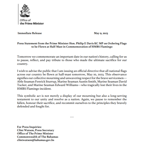 Statement from the Prime Minister Hon. Philip E. Davis, KC, MP, on Ordering Flags to be Flown at Half-Mast in Commemoration of HMBS Flamingo